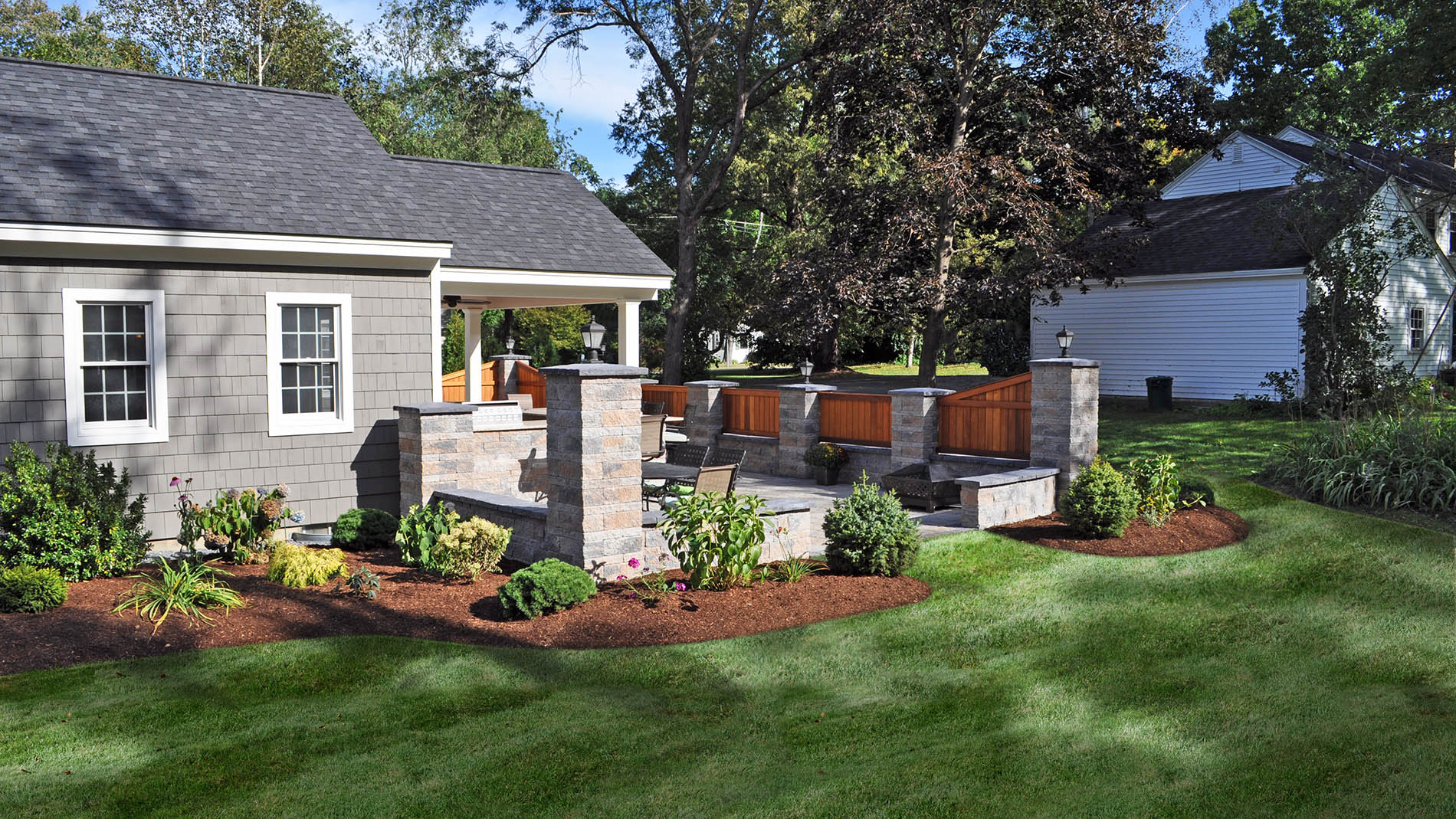 Patio landscaping with fresh plantings and mulch